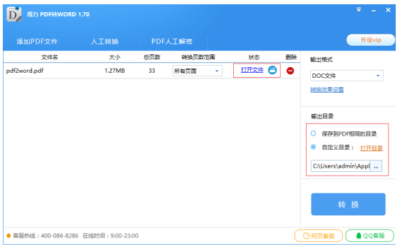 打开文件后,设置转换输出格式默认原生doc,点击“转换” (如果文件超过5页,需要升级VIP版本),
