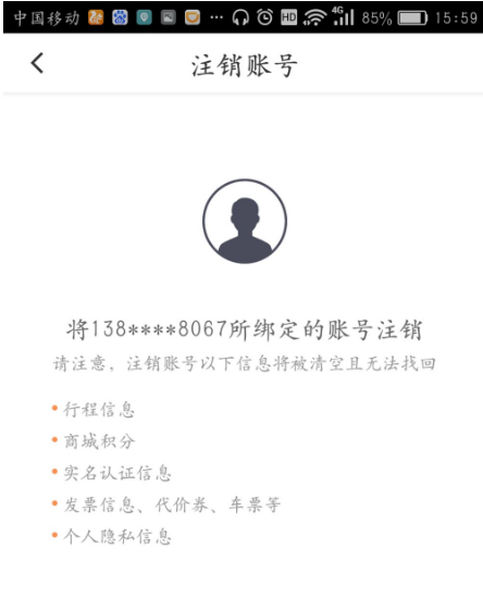 5、注销账号将会清空行程信息、商城积分、实名认证信息、个人隐私信息等,且无法找回,所以大家在进行账号注销时一定要注意。