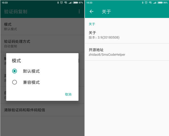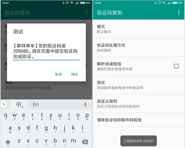 接着,就可以对APP进行一些配置了。验证码复制器APP使用很简单,你可以选择默认或者兼容模式,主要看那个能够生效。接着,你可以复制一条之前就已经存在的带验证码的短信来测试一下规则是否有效。另外,验证码复制器APP还带有清楚验证码、取件码的短信这实用功能,一下子就可以让你的短信收件箱清爽不少。