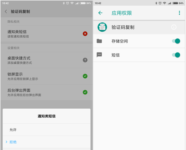 开启验证码复制器APP后是否就能直接用呢?并非如此。由于APP本身的机制,它需要读取短信等权限,有的ROM会默认禁止此类权限,所以首先要做的是到系统的应用管理菜单中,解除这APP的权限限制。
