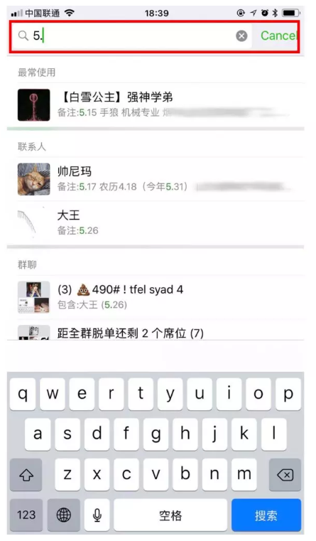 有时我们需要截图和好友的聊天记录,如果截到备注栏里写着对方的电话、住址之类的信息不免会令人尴尬或是不便,此时把信息放在描述里就很完美了。比如搜索在「描述」里标注了好友生日,输入「5.」即可快速查看五月过生日的朋友: