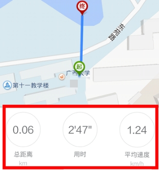 停止以后,我们可以在地图上面看到我们从哪里开始,走到哪里结束,并且还可以在下面的数据分析栏里面,看到我们的路程的总距离、所用的时间以及计算出来的平均速度;