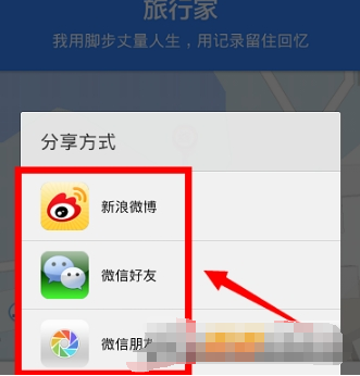 如果我们愿意分享自己的足迹的,比如出门在外旅行的,使用手机百度地图来记录自己的每一步足迹,就可以点击底下的分享按钮,在弹出来的分享窗口上,可以选择分享到新浪微博、微信好友或者自己的微信朋友圈呢!