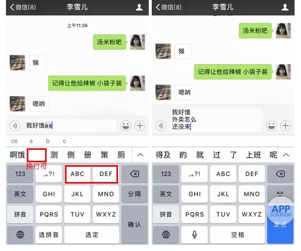 接下来,我们打开微信,看看效果如何。输完一行字,接着输入「ad」,会看到多了一个「换行符」的选项,点击,光标就到了下一行,成功!