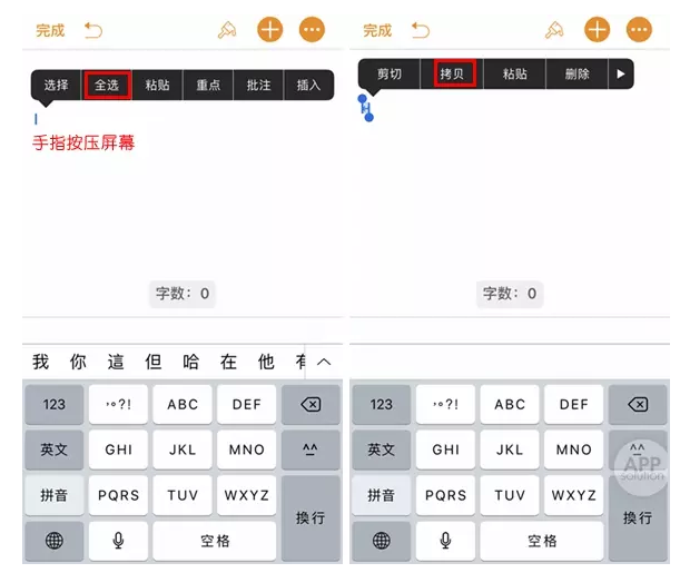 需要注意的是,这个换行符我们是看不见的,所以手指要按压一下屏幕,点击「全选」,这时候我们就可以看到换行符了,点击「拷贝」。