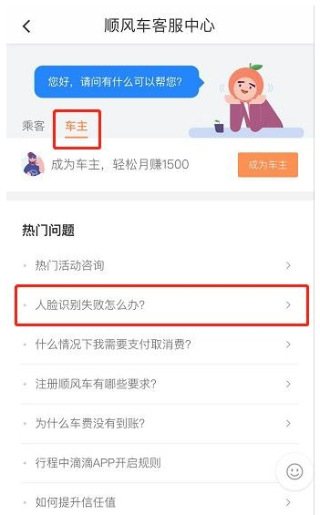 如果还有其他关于人脸识别失败的问题,打开滴滴出行App,进入顺风车首页,点击右上方“客服”按钮,进入“顺风车客服中心”,在车主端热门问题,就可以找到常见问题的答案喔。