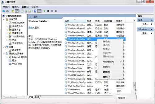 3、接下来在服务页面下方找到“windows installer”服务选项,鼠标右键弹出菜单,选择“属性”功能。如图所示:
