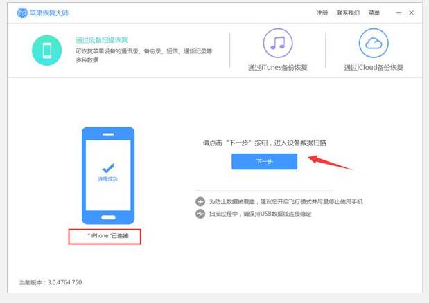 电脑中安装苹果恢复大师,然后将iPhone手机连接到电脑,待软件自动识别到设备以后,我们点击【下一步】,本文以【通过设备扫描恢复】模式为例~