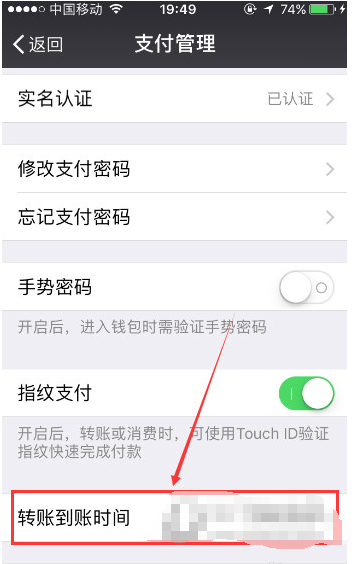 接着在“支付管理”页面我们点击“转账到账时间”按键,如果我们设置的是默认状态,此时在转账到账时间右侧会显示实时到账四字。