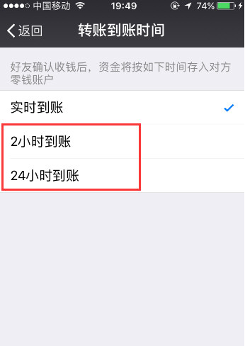 点击“转账到账时间”按键后会弹出“转账到账时间”页面,然后在此页面我们可以设置2小时到账,也可以设置24小时到账。这样我们就完成了微信延迟到账功能了。