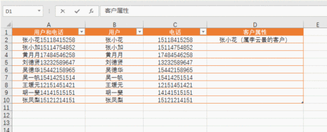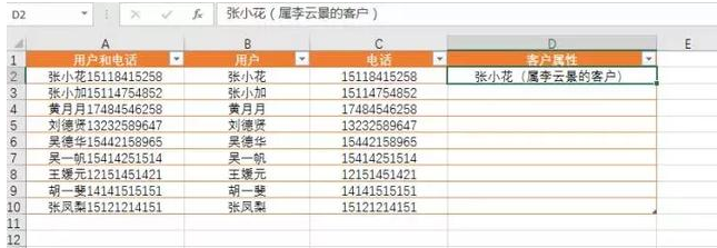 同样的做法,我们先写好第一行,让Excel能够识别拆分的样式:张小花(属李云景的客户)