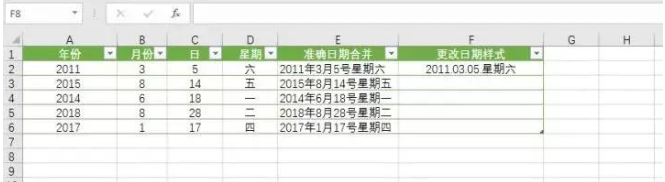 只需要写一行:2011年3月5号星期六,然后把光标放到下一行需要合并的单元格内,使用Ctrl+E快捷键就可以全部填充。