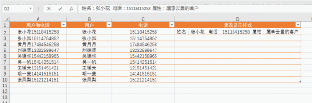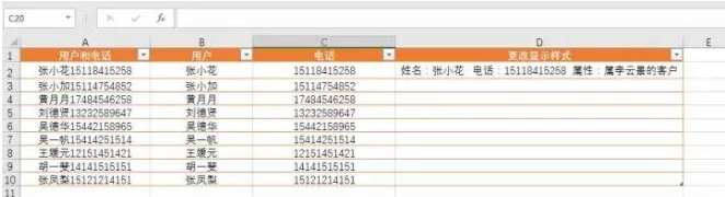 如下图,我们先写好第一行,让Excel能够识别拆分的样式:姓名:张小花 电话:15118415258 属性:属李云景的客户