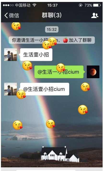 设置之后,在微信群中有人艾特你的时候,群里所有人的聊天屏幕上就全是飞吻的表情雨哦!