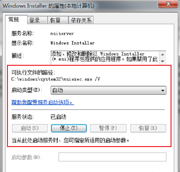 进去Windows Installer服务属性界面,启动类型设置为自动,服务进行启动,点击确定就解决了,如下图所示,
