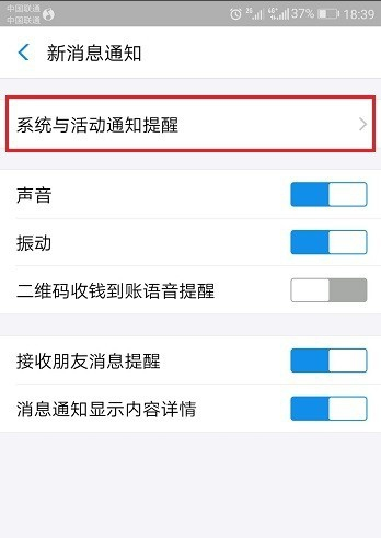 进去新消息通知界面之后,可以将下面的声音、振动全部开启,点击系统与活动通知提醒,如下图所示:
