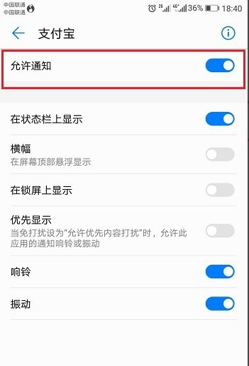 进去之后,将允许通知开启,这样支付宝应用就可以接收转账、还款等系统通知了,如下图所示:
