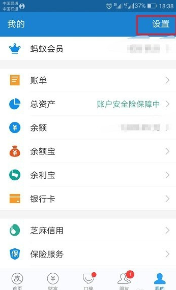 打开手机支付宝,进去我的界面,点击右上方的设置,如下图所示: