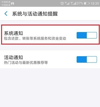 进去系统与通知提醒界面之后,将系统通知进行开启,可以看到系统通知包含转账、还款等,如下图所示: