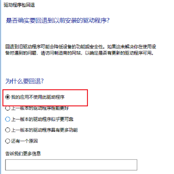 点击回退驱动程序,会让你选择原因,回退之后,点击是,如下图所示: