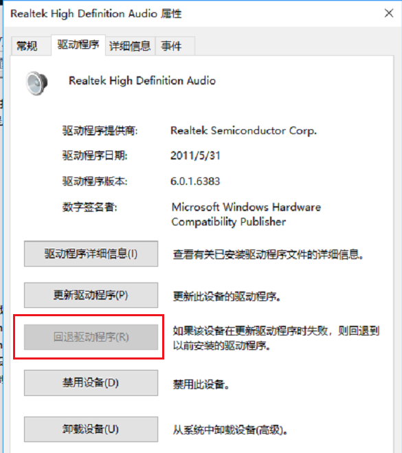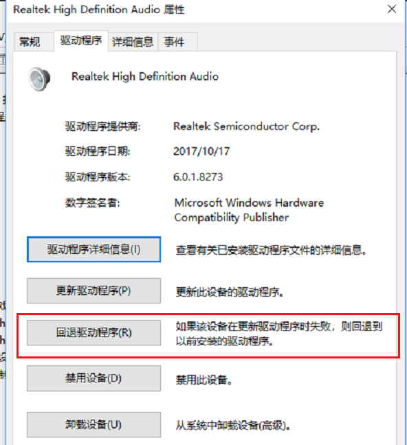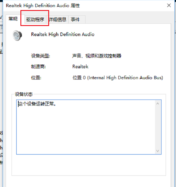 如果里面只有一个声卡驱动,操作一次就可以;如果有多个驱动需要全部还原成升级前的驱动,选中驱动High Definition Audio,右键属性,进去之后,点击驱动程序,如下图所示: