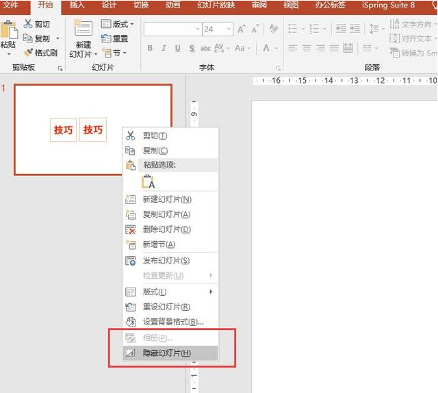 一些不需要展示的幻灯片我们怎么处理?再不能删除的情况下,我们只有将其隐藏了,右击单个幻灯片,会有隐藏幻灯片的提示。