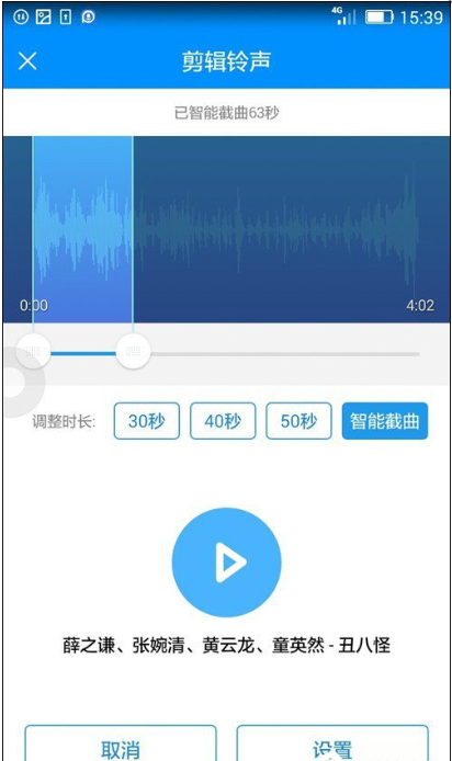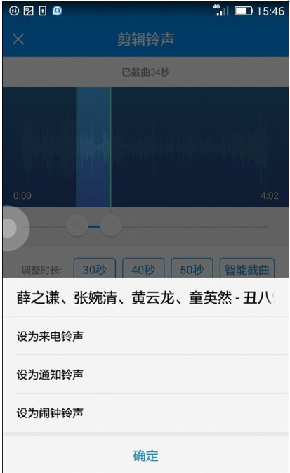 进入“剪辑铃声”界面,这里可能选择“智能截曲”,也可以拖动滑块,调整裁剪音频的起始位置和长度。