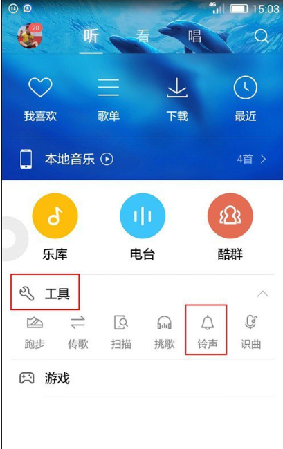 打开手机酷狗音乐,进入主界面,在“工具”栏中选择“铃声”。