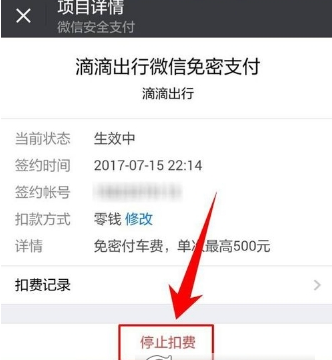 接着进入到“项目详情”页面,在页面的最下方点击【停止扣费】功能,即可完成对免密支付的取消。