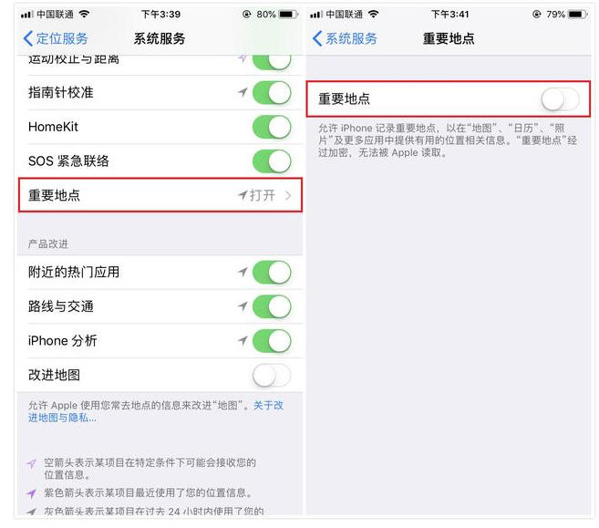 此外,小编提醒大家把重要地点这个功能也关闭,进入【设置】-【隐私】-【定位服务】-【系统服务】-【重要地点】关闭就可以了。