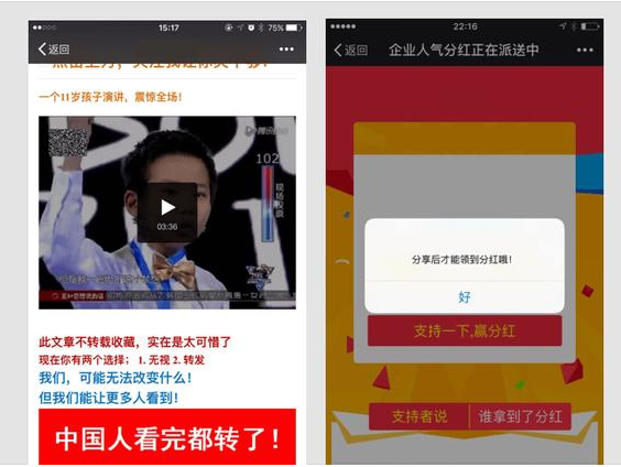 通过利益诱惑来诱导用户分享公众号文章,或者传播外链内容。这个利益可能是红包,返现,积分,抽奖等。最坑爹的时,你分享完,也没有得到任何利益,这就是完完全全全的骗局。
