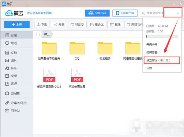 3. 打开微云之后,点击右上角的头像旁边的小箭头,下拉菜单,点击独立密码;