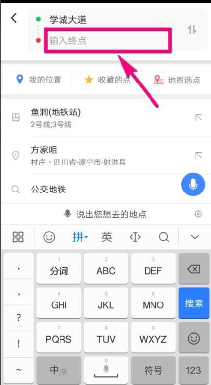 软件自动跳转到目的地输入页面(起始位置是地图根据你当前所处的位置进行自动定位的,如果定位不准可以手动输入),在图示位置手动输入你要去往的目的地。