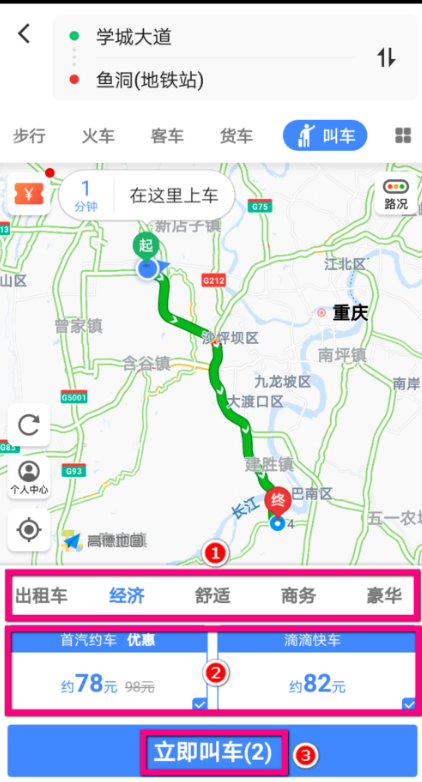 填写好目的地之后,就会转到如图所示的页面,在图示区域1中可以选择叫车的类型。在区域2中显示的是当前能够约到的网约车类型以及价格(系统默认的是都会勾选,如果你想取消某一种那么就点击对应的网约车公司一下),设置好之后,点击图示3的【立即叫车】,稍微等待一会儿就会有司机接单了,接完单司机就会与你联系,并来接驾。