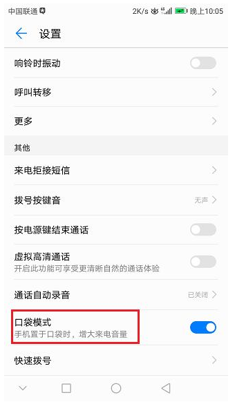 打开拨号界面的菜单,进入设置界面,点击开启口袋模式: