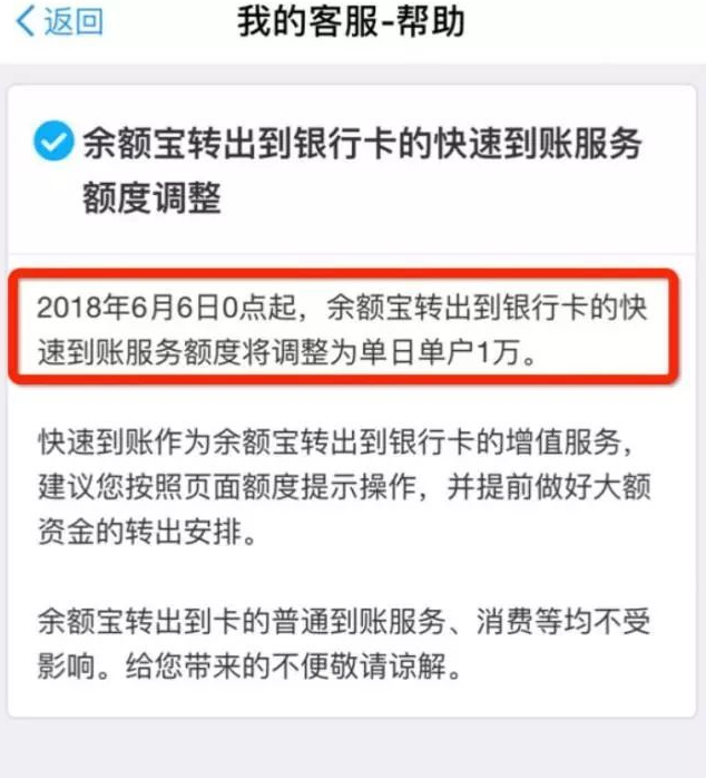 一直以来,余额宝提现额度不超过5万元都可以在两小时内快速转到银行卡,而调整后最多不超过1万,超出的部分则只能普通到账,也就是需要花一天以上的时间。
