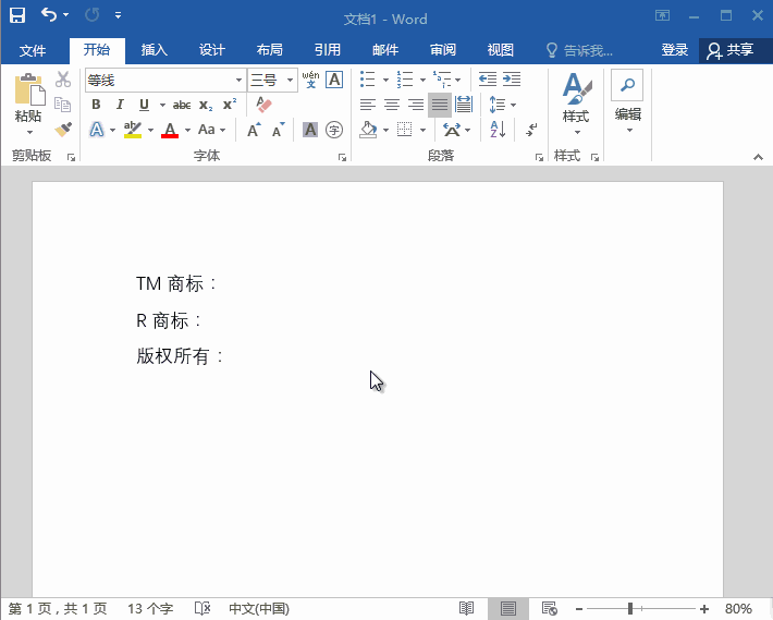 TM商标快捷键:Alt+Ctrl+T,R商标快捷键:Alt+Ctrl+R,版权符号快捷键:Alt+Ctrl+C