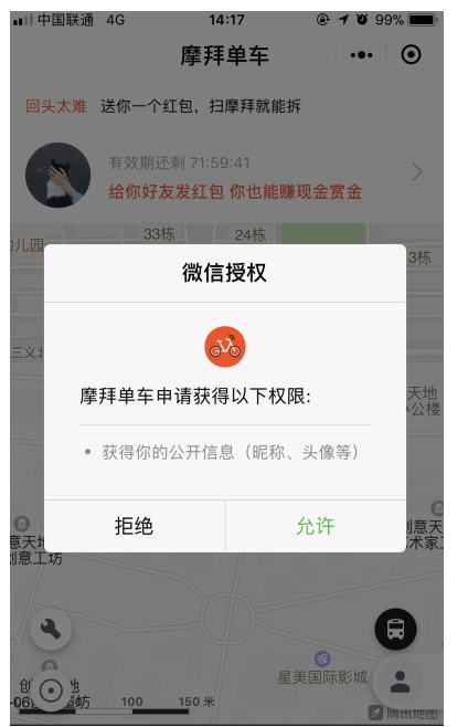 3、允许权限后,扫码解锁摩拜单车并骑行,就可以获得现金红包啦,就是这么简单~