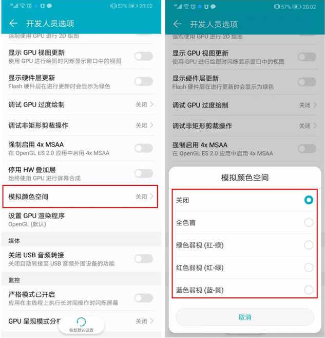 荣耀手机的开发人员选项里,还有“模拟颜色空间”这个功能,专门针对某些对颜色不敏感的人,隐藏得还挺深的吧。