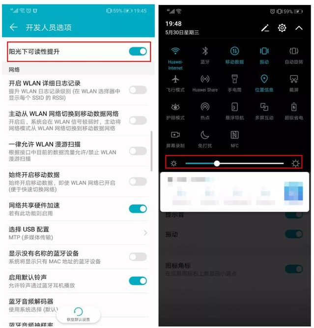 想不到吧,开发者选项还隐藏了“阳光下可读性提升”这个功能,而且默认是开启的。室外太阳光太强烈,没关系,系统会为你自动调节屏幕显示亮度。另外,你也可以下拉通知栏,根据自己的需要,手动调整显示亮度。