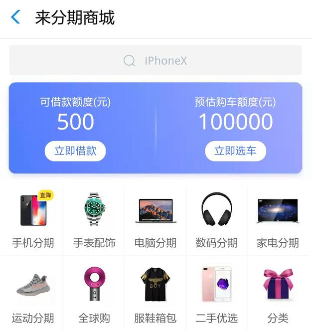 来分期贷款:是与支付宝里合作的金融业务,芝麻分就可以申请,入口在生活号或在支付宝首页直接搜“来分期”。来分期贷款的特点是免抵押、免面签,审核通过现金马上就到账。用时它除了有借款业务外,还有“来分期商城”,商城里还有购车额度和分期购车业务。对于来分期不过有很支付宝用户吐槽过,不是很好用,利息稍高。