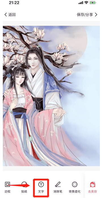 在美化图片界面中,下方功能栏中找到【文字】;