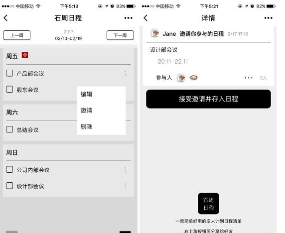 石周日程是一款智能社交日历,你的时间管理神器,多人活动一键发给好友,所有参与者都能收到提醒。