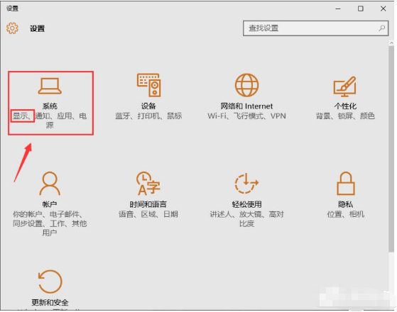 2、点击下拉菜单里的【设置】选项,进入Win10设置对话窗口,在设置选项里找到【系统】功能选项,该选项下有【显示】功能按钮;