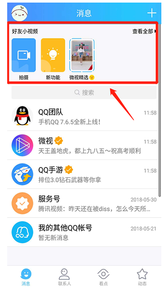 手机QQ安卓版7.6.5版本在今天正式上线,大家期待的“好友小视频”功能来啦,你可以观看好友分享的短视频消息,还能点击拍摄记录自己的生活。