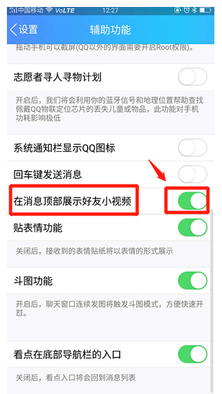 在【辅助功能】中将【在消息顶部展示好友小视频】按钮关闭即可将QQ好友小视频关闭。