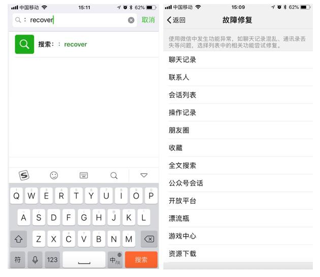 当然,微信团队针对用户数据信息丢失也有一定的弥补措施。如在微信中找回信息,可尝试在添加朋友页面的输入栏中,直接输入“:recover”,之后就进入到微信的故障修复后台,对于之前的一些聊天记录、联系人、回话列表、操作记录、朋友圈、收藏、公众号会话等信息都可以尝试找回。但需要注意的是,恢复微信数据内容有限,并不能无限恢复。