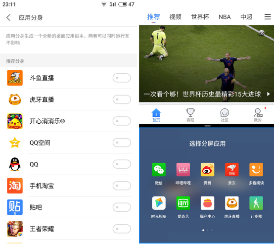 一个人看比赛难免觉得单调,总想和朋友们分享一下感想,Flyme 分屏模式能让你一边看比赛一边和朋友畅聊比赛感想。分屏模式的开启方式十分简单,你只需要呼出后台界面,选择下拉想要分屏的应用,在随后的界面选择分屏就能快速体验到该功能带来的便利。