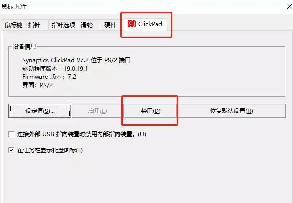 第二步:在“鼠标属性”窗口中,我们选择“clickpad”选项卡,这个就是触摸板的功能,我们点击“禁用”,最后点击“确定”。如图: