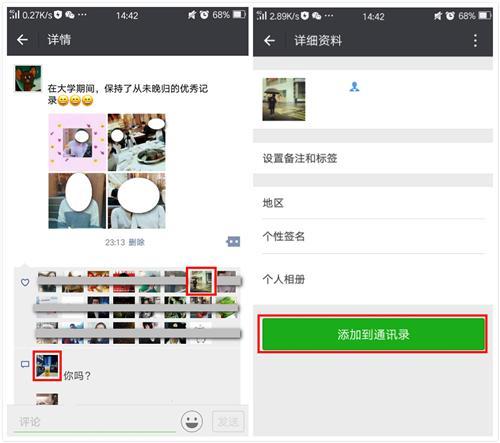 翻翻你的朋友圈,找到与该好友互动的地方。(比如点赞或者评论)戳他的头像,就能添加联系人了。
